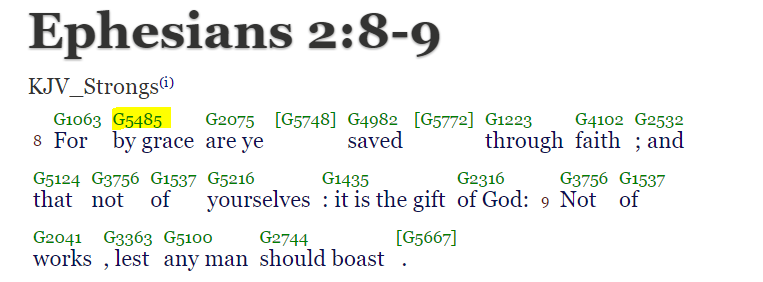 - As you can see, Strong’s Numbers are displayed in green above the actual English words. This is perfect. Click on G5485 to get the Greek dictionary definition.